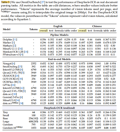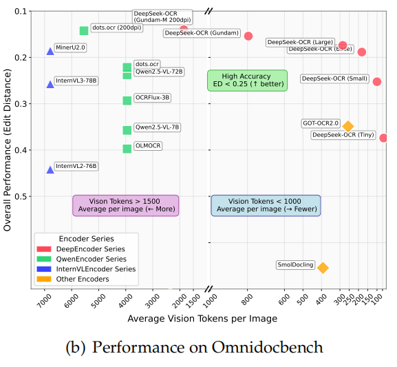 模型由 DeepEncoder + DeepSeek3B-MoE 组成;在 OmniDocBench 基准上取得 最先进(state-of-the-art)性能,且使用的视觉 token 数最少;还能解析图表、化学式、几何图形、自然图像等多种内容;具备极高生产效率:20 个节点(8×A100-40G)每天能生成 3300 万页训练数据。