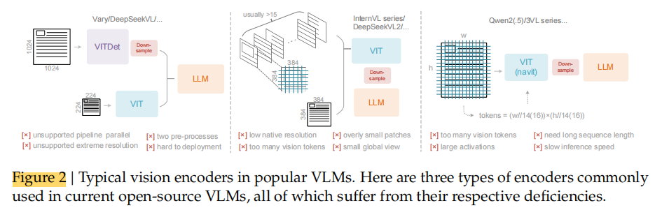 各有优势,但在高分辨率输入下都存在明显局限,因此需要一种新的、更高效的视觉编码方案(即作者后面提出的 DeepEncoder)。