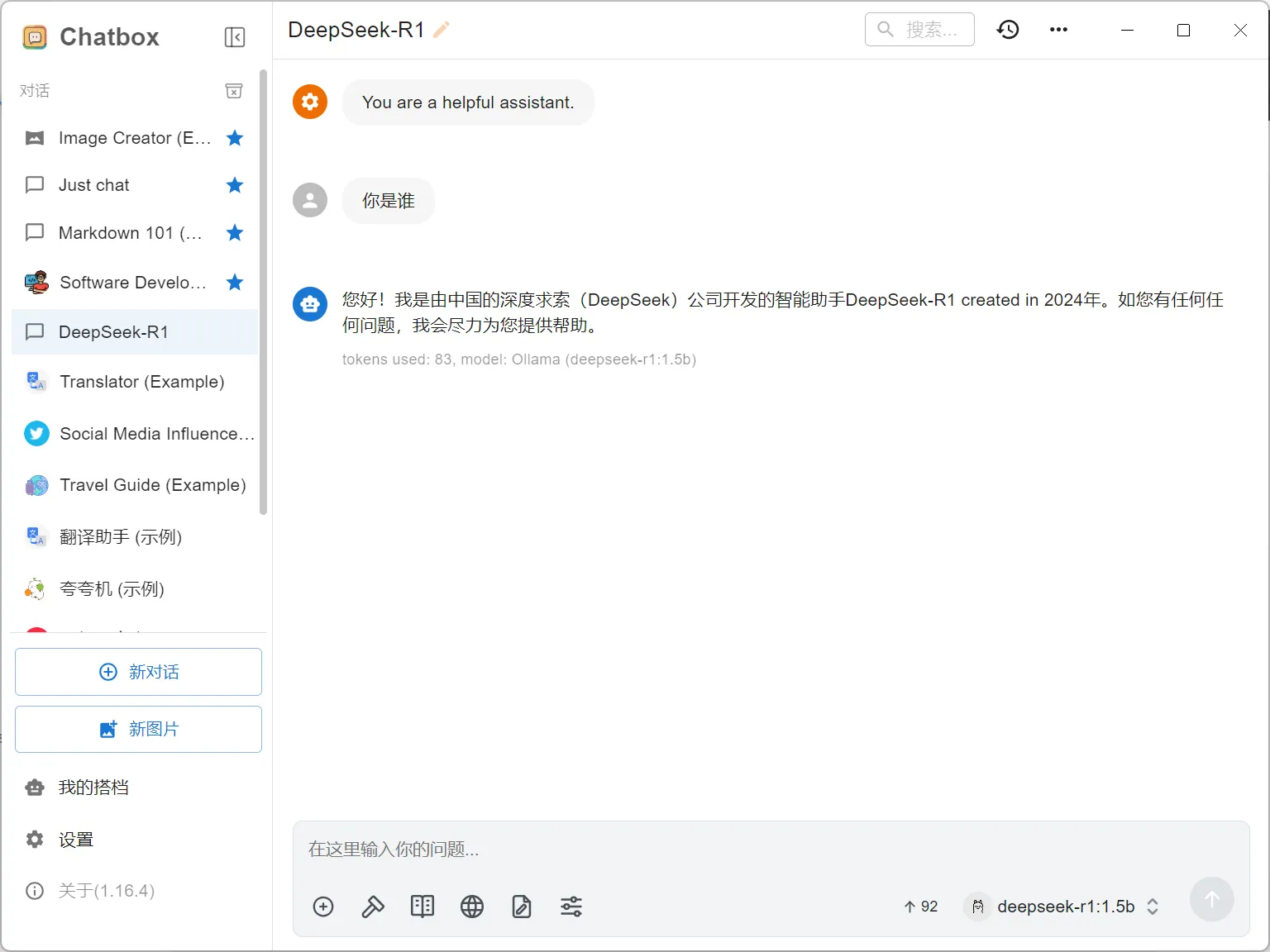 - 在 Chatbox 的界面中输入问题,底层实际调用的是 Ollama 的推理服务。