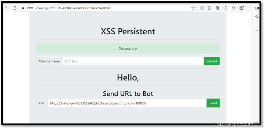 </head><body><div class="container"><div class="jumbotron text-center"><h1>XSS Persistent</h1><hr><!-- Alert --><div id="alert"><div id="success" class="alert alert-success" role="alert" style="display: none;"></div><div id="fail" class="alert alert-danger" role="alert" style="display: none;"></div></div><!-- Body --><div><form action="" method="POST"><div class="input-group mb-3"><div class="input-group-prepend"><span class="input-group-text">Change name</span></div><input type="text" class="form-control" placeholder="CTFHub" id="name" name="name"><div class="input-group-append"><input type="submit" value="Submit" class="btn btn-success"></div></div>