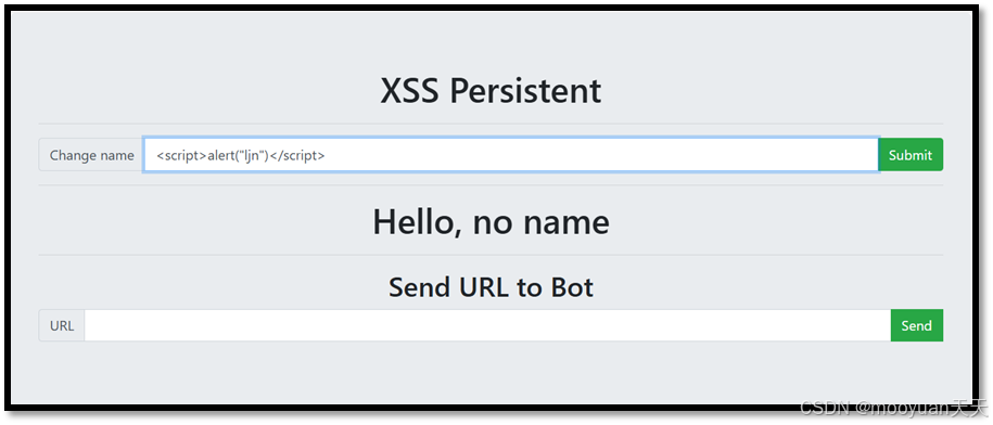 页面结构:使用 Bootstrap 框架构建,包含标题、表单、输出区域和一个发送 URL 给机器人的功能模块,整体布局简洁,聚焦于 XSS注入测试场景。