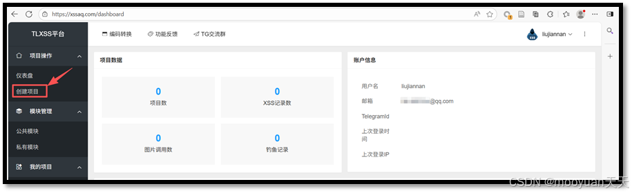登录后效果如下所示,注意左侧菜单栏中的“创建项目”选项,这是我们会用到的功能。