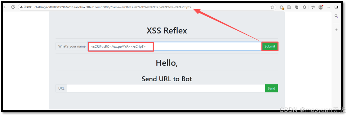 script写成了sCRiPt和sCrIpT。这是一种简单的绕过技术,用于规避那些只进行简单大小写匹配(如查找<script)的初级WAF(Web应用防火墙)或输入过滤器。 -