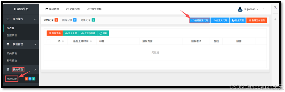 在“我的的项目”点击刚才创建的项目“mooyuan”,再点击右上角的查看配置源码,如下图所示。