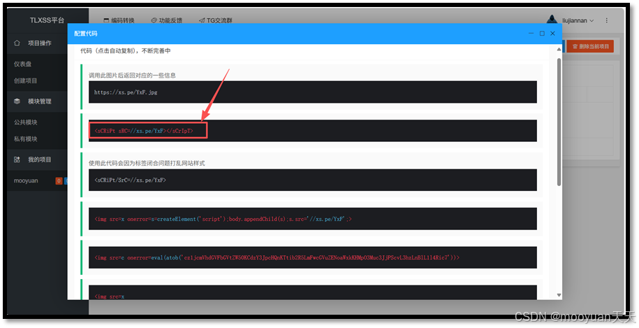 此时网页弹框如下所示,我们需要在配置代码中选择自己要使用的脚本,这里我们选择第二个即可,如下所示(特别注意:每个人的payload各不相同)。