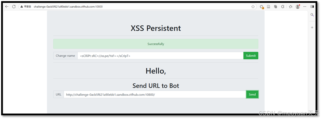 在CTF中,XSS通常需要管理员触发。将上一步构造好的完整恶意URL提交给平台提供的“模拟管理员”或“机器人”进行访问,即复制上一步村出现XSS攻击的URL到send URL to Bot对应的地址框中。点击send等价于让bot也执行这个XSS注入攻击如下所示,执行成功,页面返回successfully。