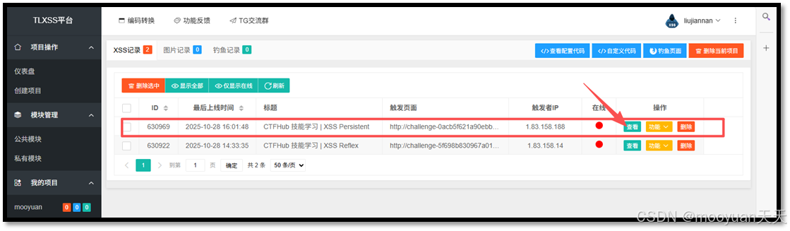 - 平台接收并记录请求数据,测试者通过平台查看结果,确认XSS触发情况。