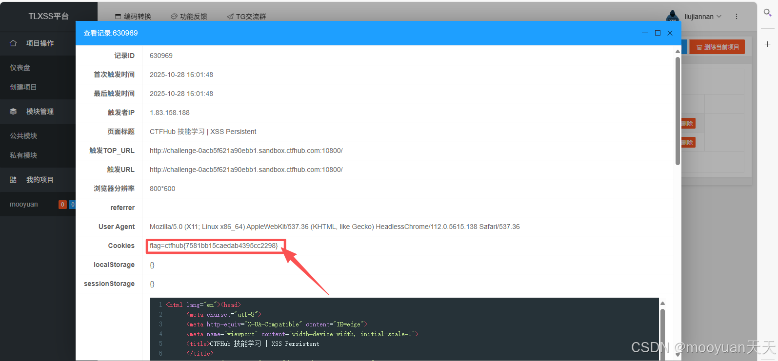 观察XSS平台,如下图红框内容所示说明服务器已获取存储型XSS注入关卡的cookie。