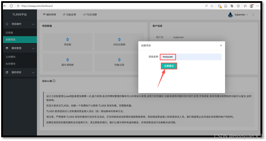 点击左侧菜单栏中的“创建项目”,随便起个名字“mooyuan”,点击立即提交,如下所示。