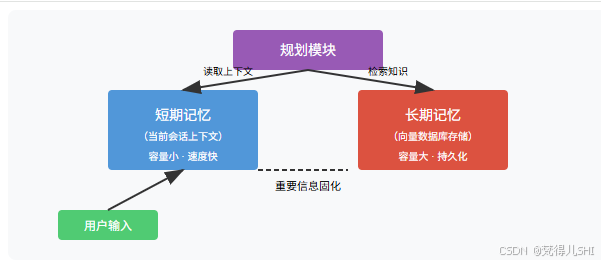 - 例:Agent 规划行程时,短期记忆中有 "用户喜欢安静"→触发长期记忆检索 "用户过去住过的安静酒店类型"。