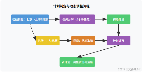 动态计划调整:当某个子任务执行失败或出现新信息时,计划需要实时更新。例如: