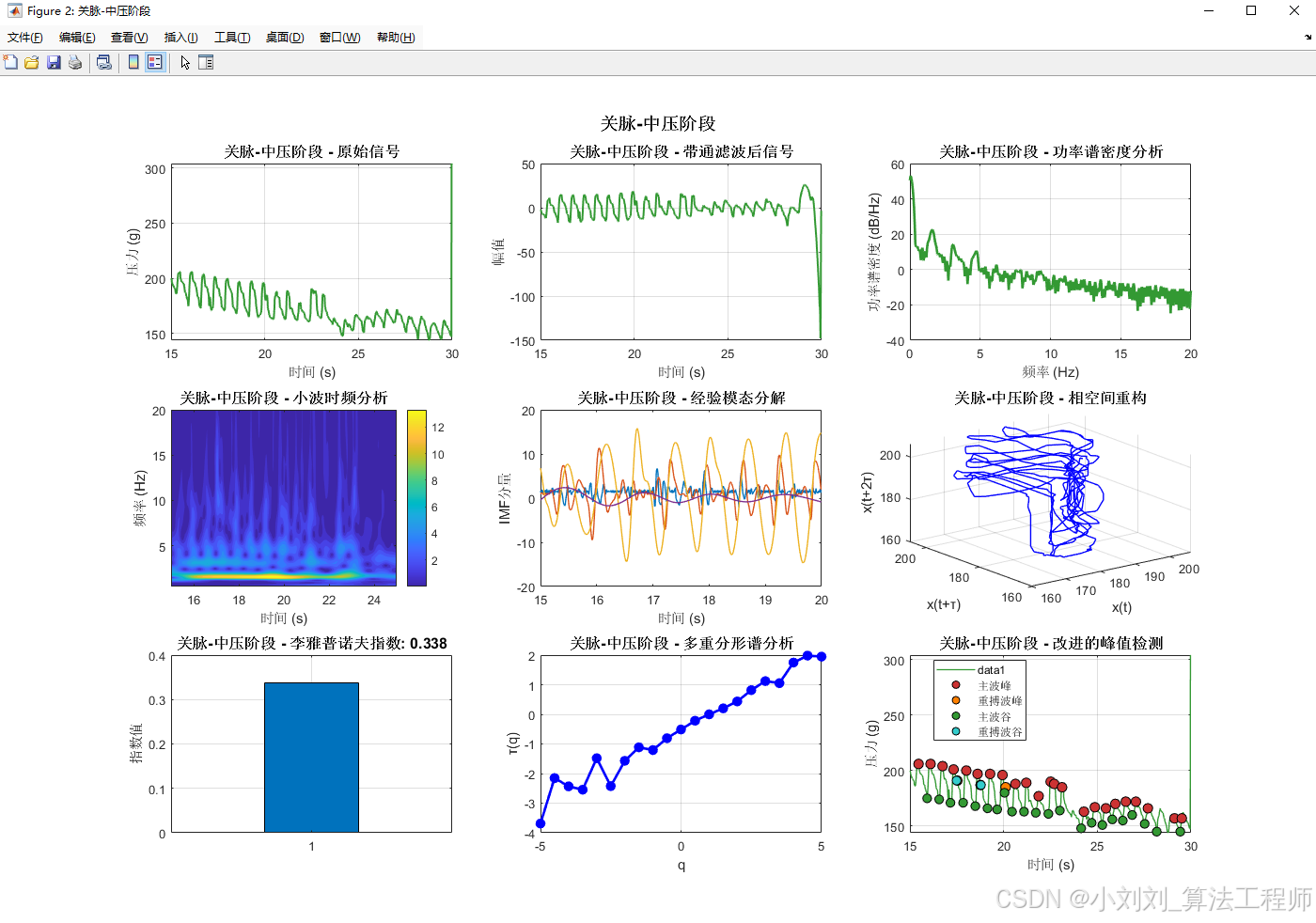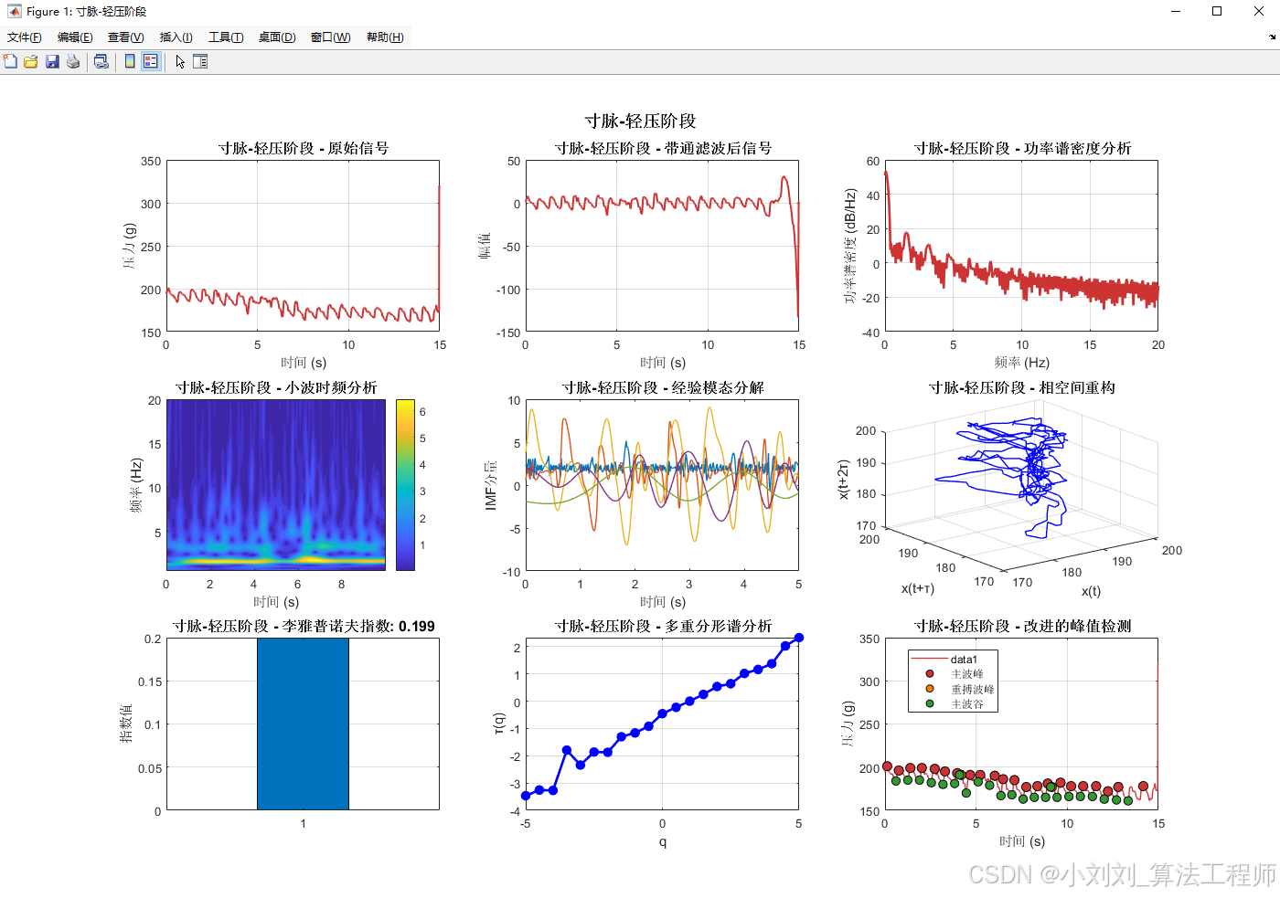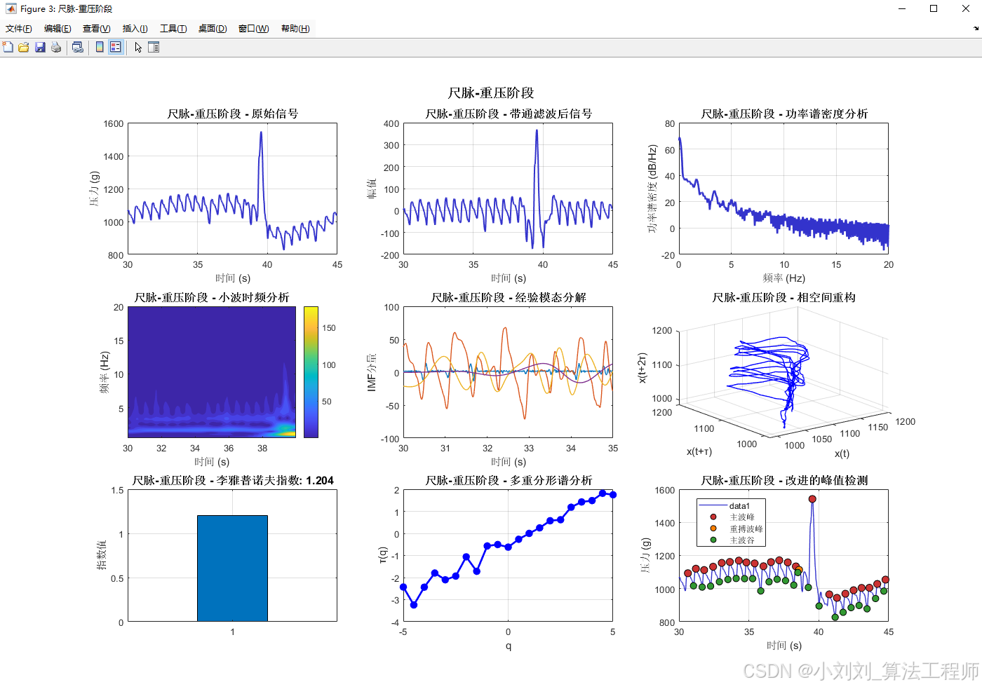 (1)原始信号与滤波信号;(2)功率谱密度分析;(3)小波时频分析;(4)经验模态分解;(5)相空间重构;(6)李雅普诺夫指数;(7)多重分形分析;(8)改进的峰值检测