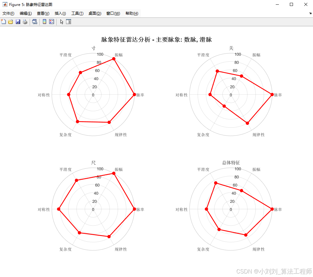圆形分布(平和脉象,各特征均衡);不规则分布(病理脉象,特征失衡);特定方向突出(对应脉象特征明显)。其中的寸关尺特征差异反映相应脏腑状态;一致性分析判断整体气血状况。该脉象特征雷达图为中医辨证提供量化依据,辅助判断病位、病性。