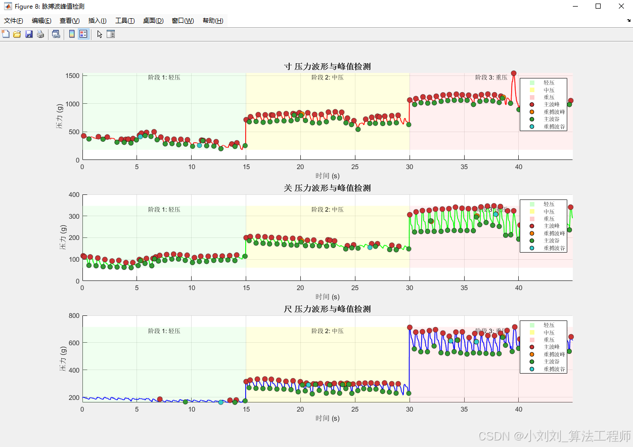 峰值检测图清晰展示了寸、关、尺三部脉搏波在不同压力阶段(轻压、中压、重压)的波形特征和峰值分布情况。