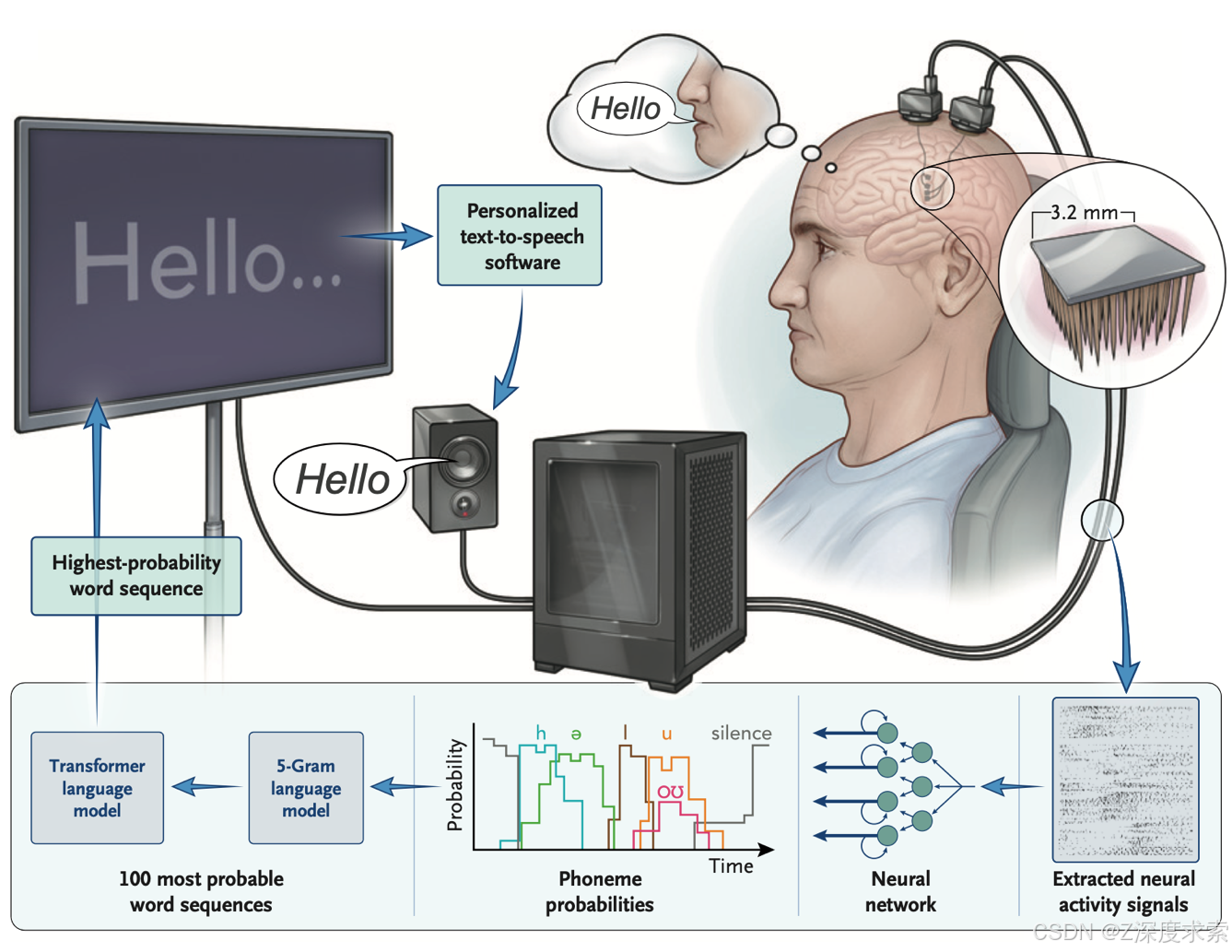 肌萎缩侧索硬化症(ALS)等神经系统疾病俗称 “渐冻症”,会导致患者出现构音障碍,严重影响沟通能力,进而增加患者孤立、抑郁风险,降低生活质量,甚至影响终末期生命维持治疗决策。目前现有的增强和辅助沟通技术(如眼动追踪仪、头部追踪仪)信息传输速率低,且会随患者自主肌肉控制能力丧失而愈发难以使用。脑机接口作为一种极具潜力的沟通技术,可直接从神经信号中解码用户的预期言语,但此前的语音神经假体存在训练需求大、准确率有限等问题。