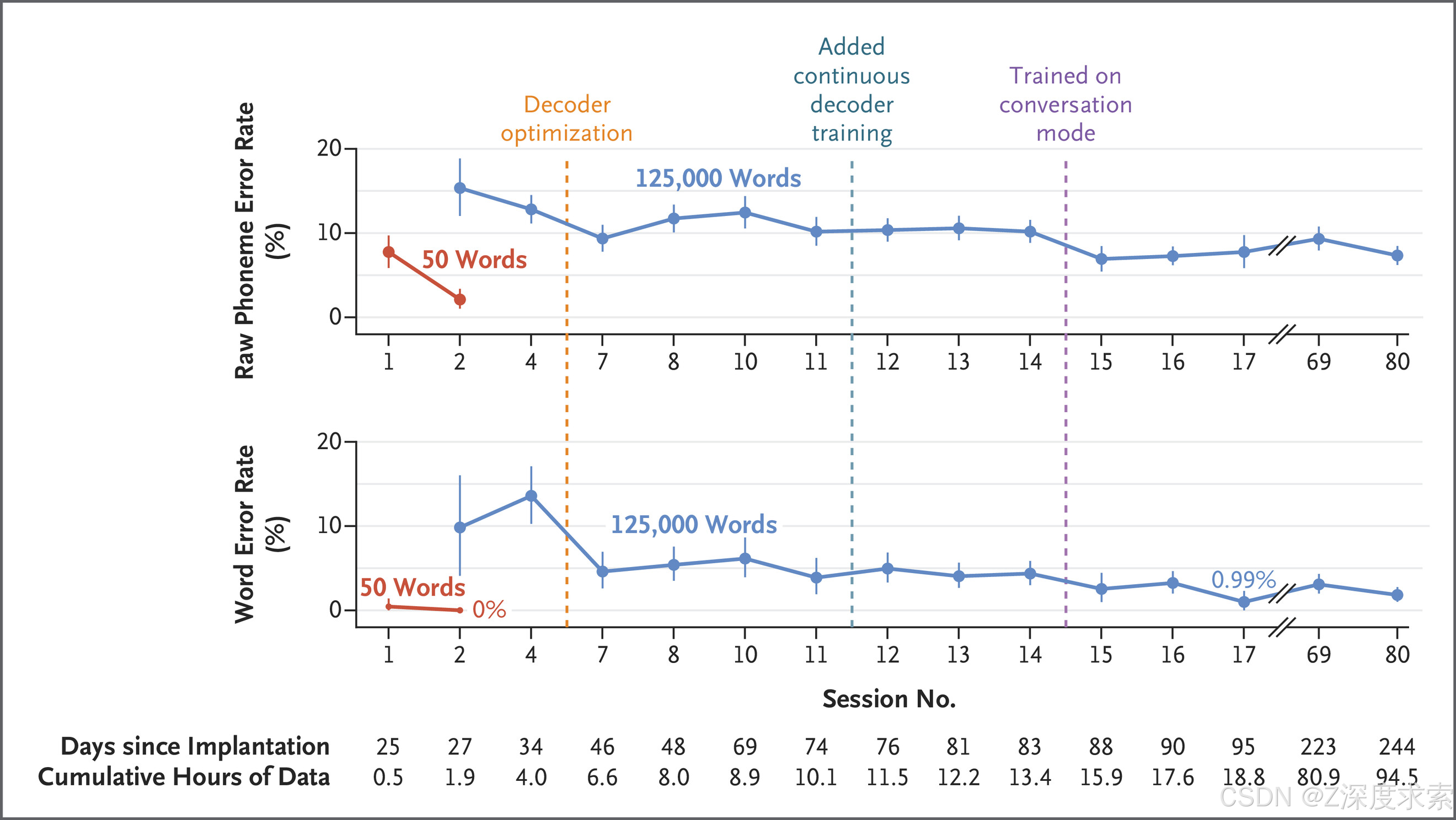 2023年8月(术后25天)开始数据采集,在患者家中进行84个疗程,持续32周。每个疗程包含多个任务模块(时长5-30分钟),患者在模块间休息。任务包括指令延迟复制任务(屏幕显示单词,患者在视觉或听觉提示后尝试说出单词)和患者自定节奏对话模式(患者尝试说出任意内容,系统词汇量限制为12.5万个)。采用Blackrock Neurotech公司NeuroPort系统采集信号,通过公开软件进行实时信号处理和解码,每80毫秒将皮质记录活动预测为最可能的英语音素,结合开源语言模型将音素序列组合为单词并生成句子。