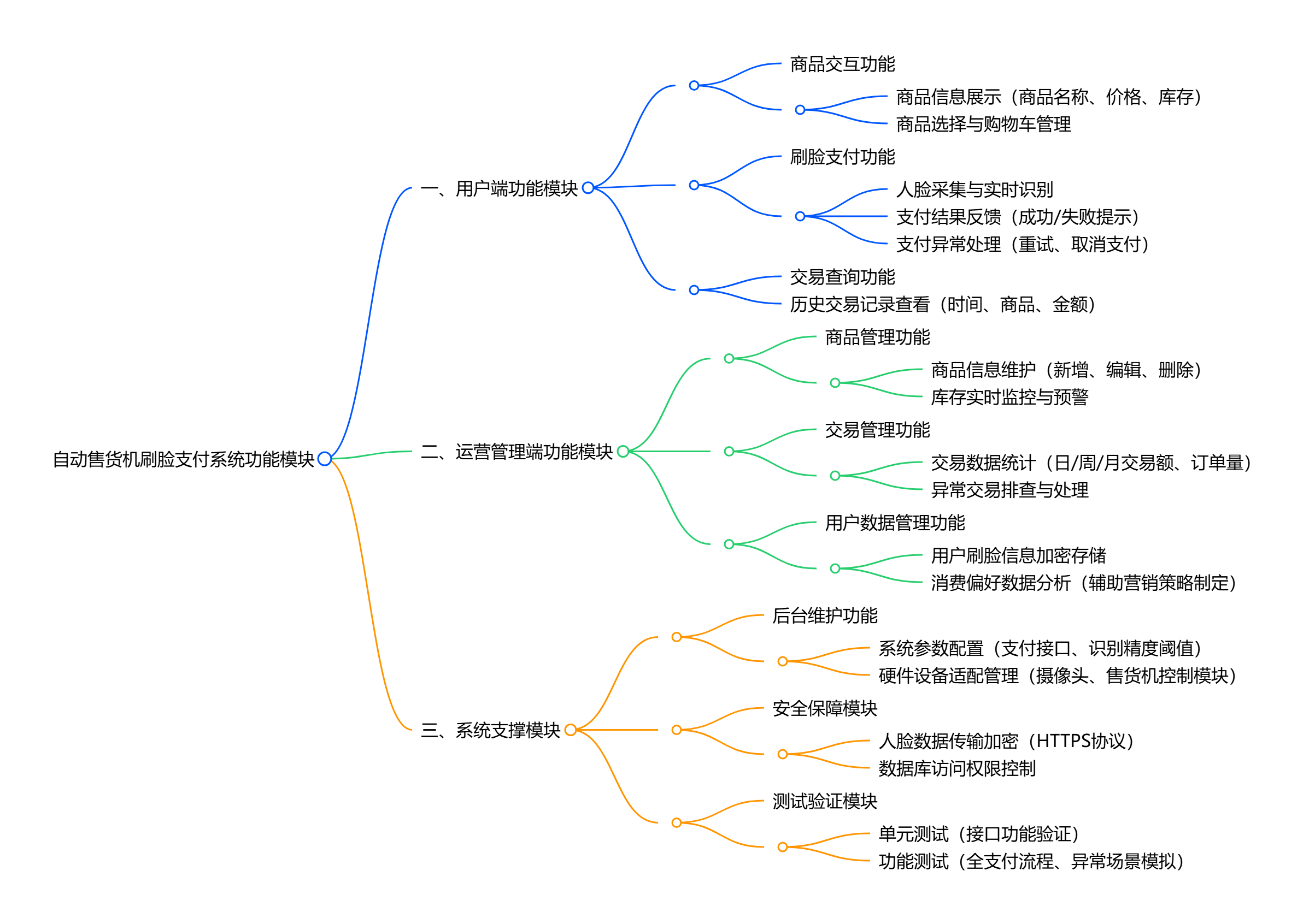此外,系统包含完整的测试环节,通过单元测试与功能测试保障刷脸识别准确率、支付流程稳定性及异常场景(如支付失败重试、数据传输安全)的处理能力,最终实现用户快速支付、商家高效运营的目标。