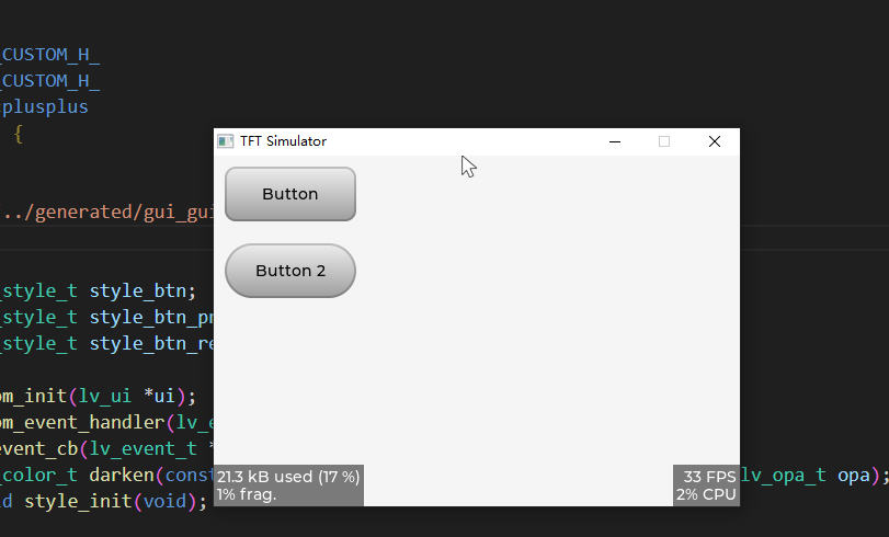 {/*Create a simple button style*/lv_style_init(&style_btn);lv_style_set_radius(&style_btn, 10);lv_style_set_bg_opa(&style_btn, LV_OPA_COVER);lv_style_set_bg_color(&style_btn, lv_palette_lighten(LV_PALETTE_GREY, 3));lv_style_set_bg_grad_color(&style_btn, lv_palette_main(LV_PALETTE_GREY));lv_style_set_bg_grad_dir(&style_btn, LV_GRAD_DIR_VER);lv_style_set_border_color(&style_btn, lv_color_black());lv_style_set_border_opa(&style_btn, LV_OPA_20);lv_style_set_border_width(&style_btn, 2);lv_style_set_text_color(&style_btn, lv_color_black());/*Create a style for the pressed state.*Use a color filter to simply modify all colors in this state*/static lv_color_filter_dsc_t color_filter;lv_color_filter_dsc_init(&color_filter, darken);lv_style_init(&style_btn_pressed);lv_style_set_color_filter_dsc(&style_btn_pressed, &color_filter);lv_style_set_color_filter_opa(&style_btn_pressed, LV_OPA_20);/*Create a red style. Change only some colors.*/lv_style_init(&style_btn_red);lv_style_set_bg_color(&style_btn_red, lv_palette_main(LV_PALETTE_RED));lv_style_set_bg_grad_color(&style_btn_red, lv_palette_lighten(LV_PALETTE_RED, 3));
