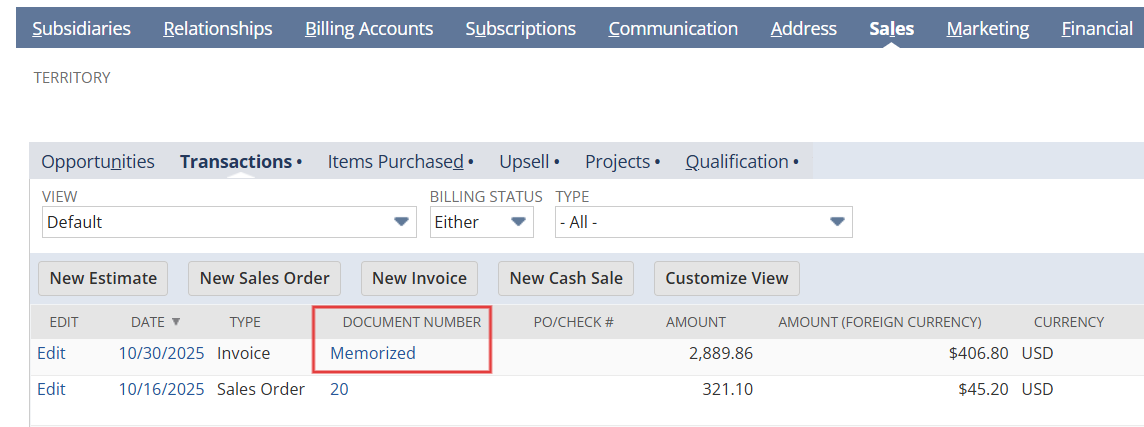 在客户的Transactions的记录下面,如果是还未生成正式transaction的memorized transaction,我们是能够看到Doucment Number位置是有Memorized的字样的,如下图: