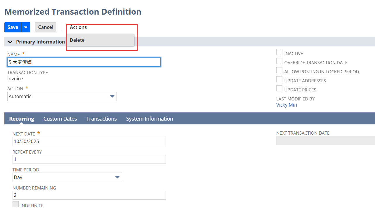找到最原始的Memorized Transaction设置页面,在编辑状态下进行删除,然后我们刷新原来打开的Invoice页面,会看到提示“该记录已经不存在”。