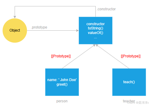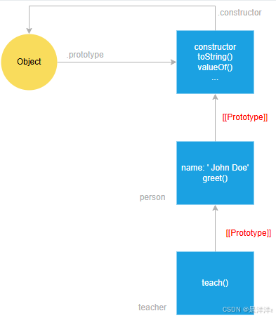 teacher.__proto__ = person;console.log(teacher.greet()); // Hello, my name is John Doe