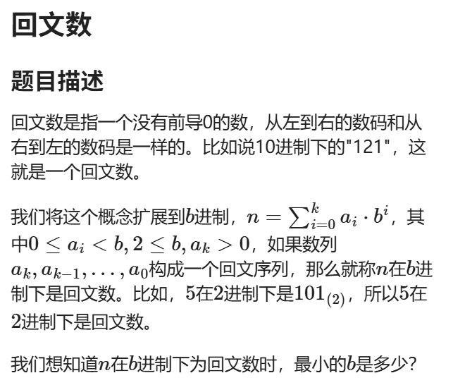 我存在的疑惑:按照给出的样例 6的最小可构成回文数的进制是5,所以我下意识觉得只需要遍历2~n-1的数,因为n在n-1进制下肯定为11,但却是错误0分,必须遍历到n+1;