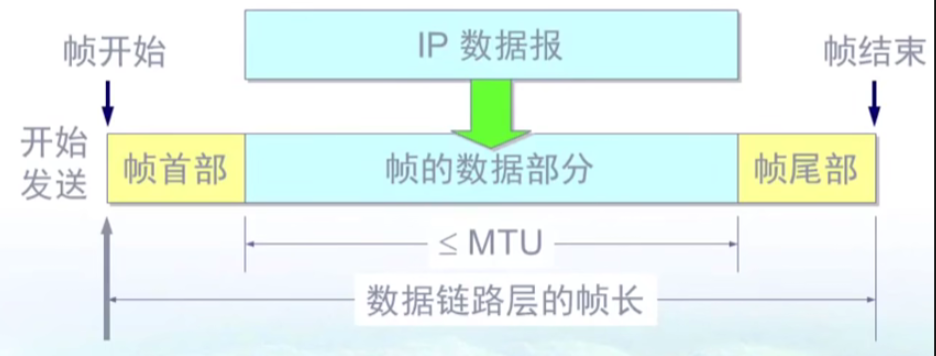 为了提高帧的传输效率,应当使帧的数据部分长度尽可能地大于首部和尾部的长度。但是,每一种链路层协议都规定了所能传送的帧的数据部分长度上限——最大传送单元MTU (Maximum Transfer Unit)。下图给出了帧的首部和尾部的位置,以及帧的数据部分与MTU的关系。