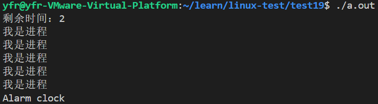 {alarm(3);sleep(1);int n = alarm(5);printf("剩余时间:%d\n",n);while(1){printf("我是进程\n");sleep(1);}return 0;