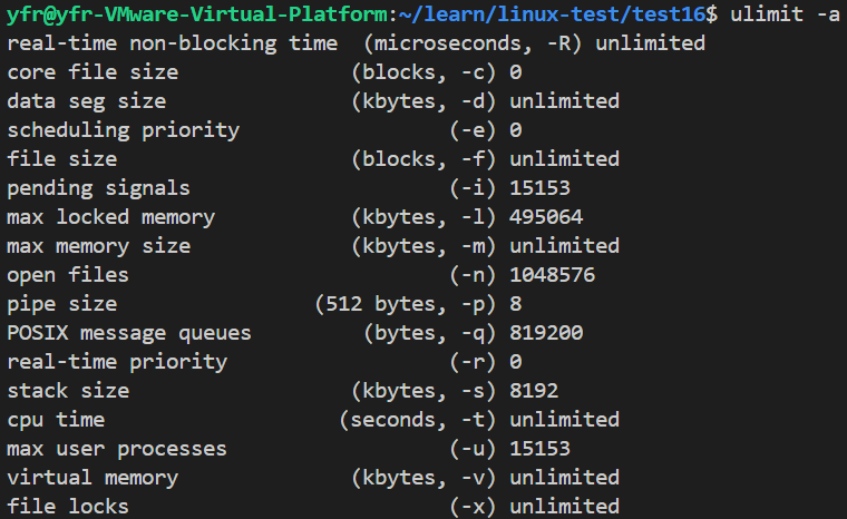 ulimit 是一个用于显示和限制用户进程资源使用情况的 Shell 内建命令。它主要用于控制一个 Shell 及其启动的进程 所能使用的系统资源。