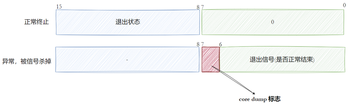 当程序正常退出时,我们只需要存储退出状态即可;当程序异常退出时,我们存储了退出状态以及退出信号(信号告诉的是我们出了什么异常),这还有一个core dump标志位,干什么的呢?