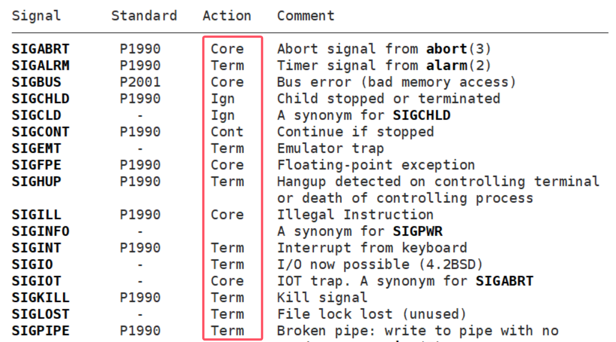 我们查信号表的时候就看到了这两种中断方式:Core和Term