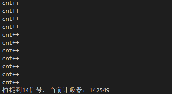 {signal(SIGALRM,handler);alarm(1);while(1){cnt++;//内存操作printf("cnt++\n");//IO操作}return 0;