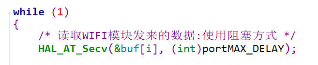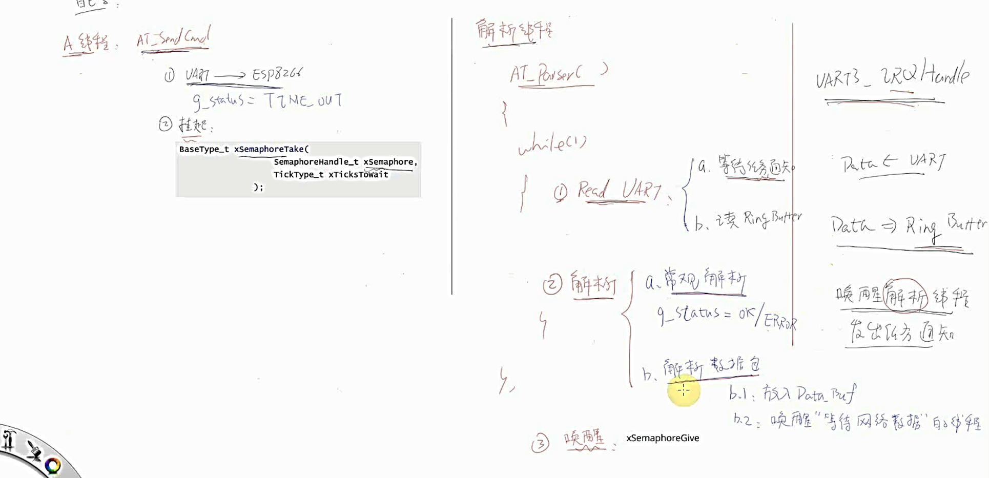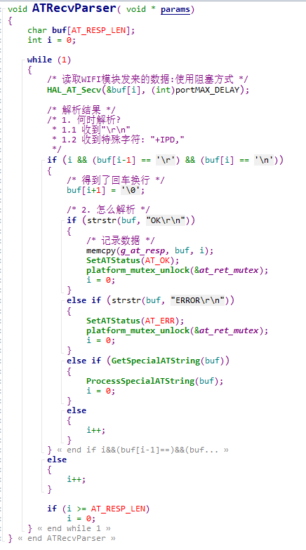 在UART3_IRQHandle中,当串口接收到数据时,每接收到一个数据字符就会将其存放进循环缓冲区Buffer中,然后产生中断唤醒解析线程,发出任务通知。而在解析线程中,时刻等待任务通知,当UART3_IRQHandle产生中断,发出任务通知后,解析线程就会读取环形缓冲区Buffer中的数据,但是并不是每读取一个字符就分析一次数据,而是要读取字符“\r”和“\n”之后,表示读取到完整的数据之后,再分析数据。