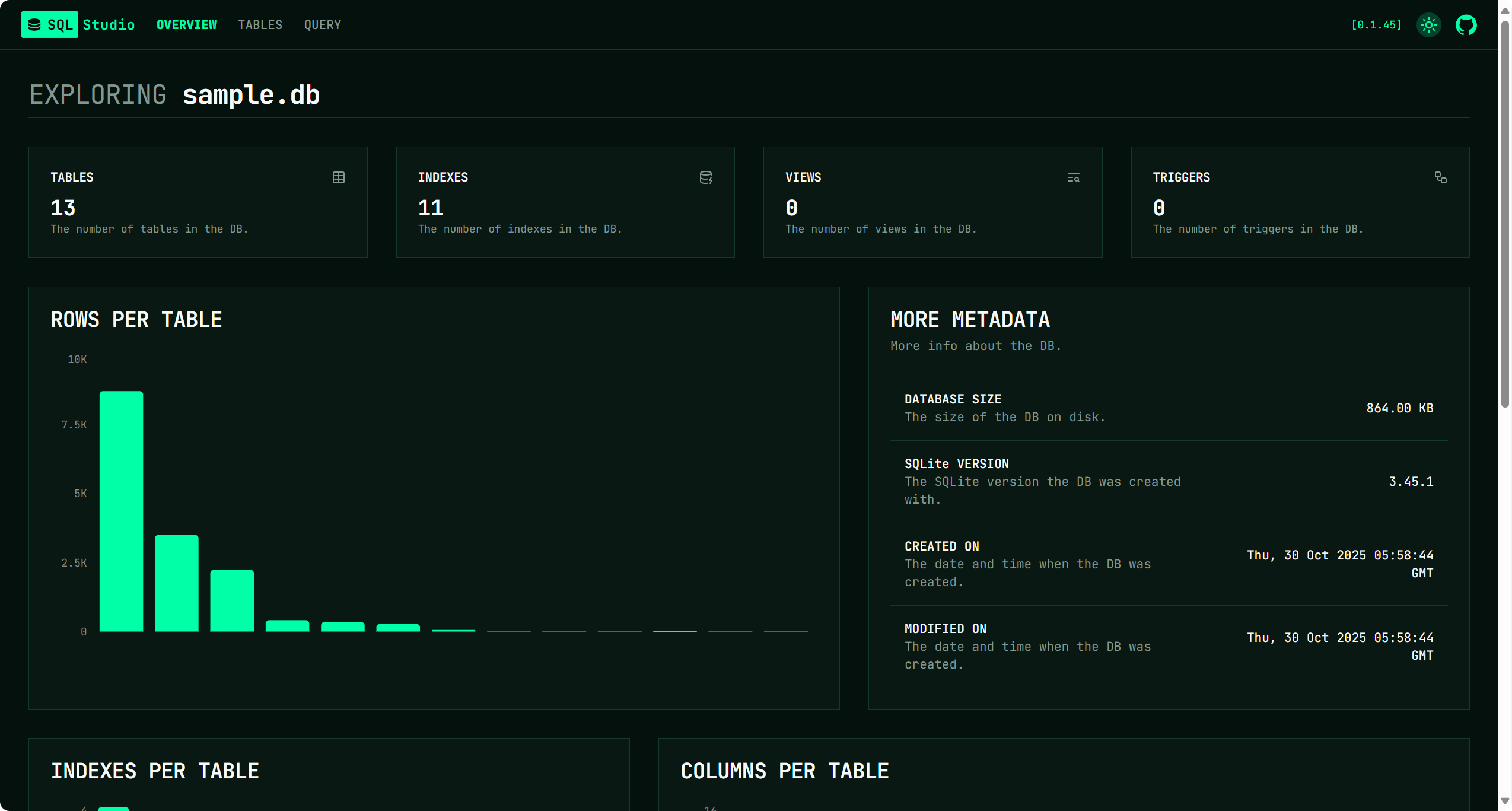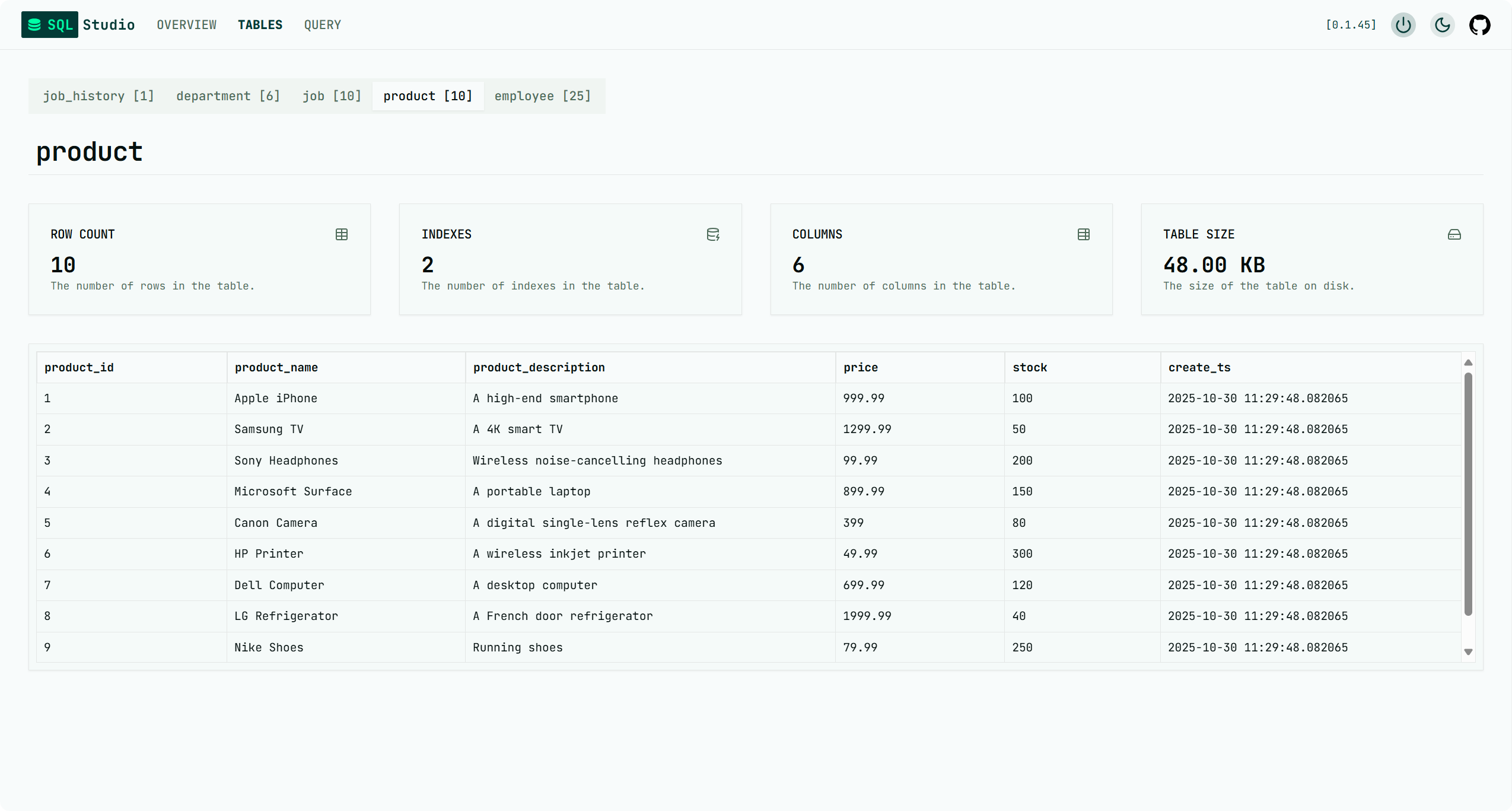 Single binary, single command SQL Database Explorer.Usage: sql-studio.exe [OPTIONS] <COMMAND>Commands:sqlite A local SQLite databaselibsql A remote SQLite database via libSQLlocal-libsql A local SQLite database via libSQLpostgres A PostgreSQL databasemysql A MySQL/MariaDB databaseduckdb A local DuckDB databaseclickhouse A ClickHouse databasemssql A Microsoft SQL Server databasehelp Print this message or the help of the given subcommand(s)Options:-a, --address <ADDRESS> The address to bind to [env: ADDRESS=] [default: 127.0.0.1:3030]-t, --timeout <TIMEOUT> Timeout duration for queries sent from the query page [env: TIMEOUT=] [default: 5secs]-b, --base-path <BASE_PATH> Base path to be provided to the UI. [e.g /sql-studio] [env: BASE_PATH=]--no-browser Don't open URL in the system browser [env: NO_BROWSER=]--no-shutdown Don't show the shutdown button in the UI [env: NO_SHUTDOWN=]-h, --help Print help-V, --version Print version