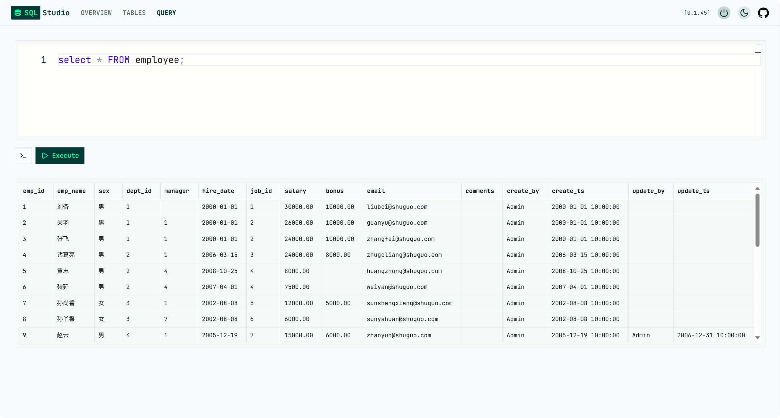 - 轻量级:SQL Studio 编译成了单个二进制文件,大小只有几十 MB,启动服务只需要一个命令。