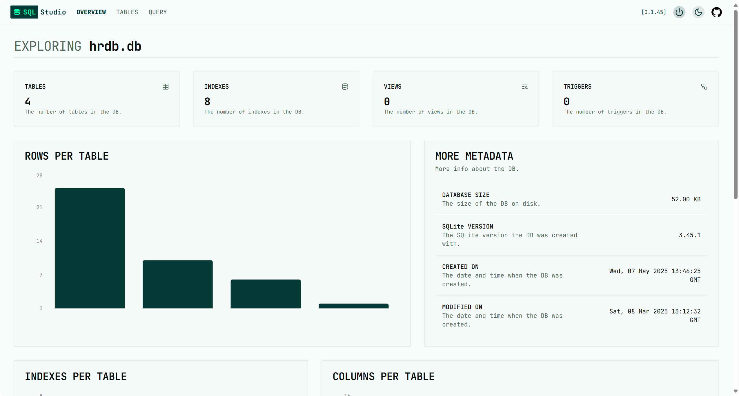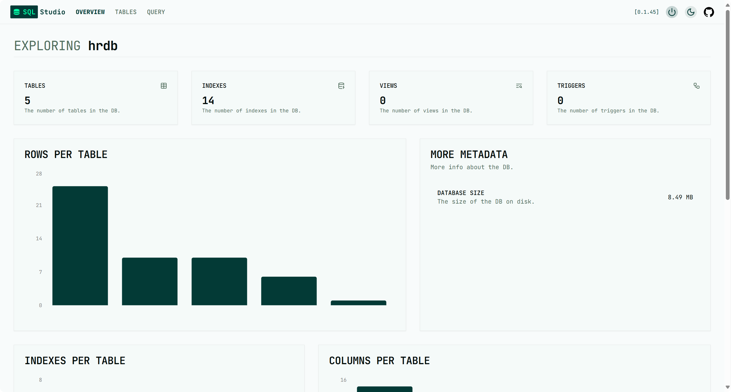 - 表结构概览:TABLES 页面显示了每个表的具体信息,包括字段数量、索引数量、总行数以及表的大小。