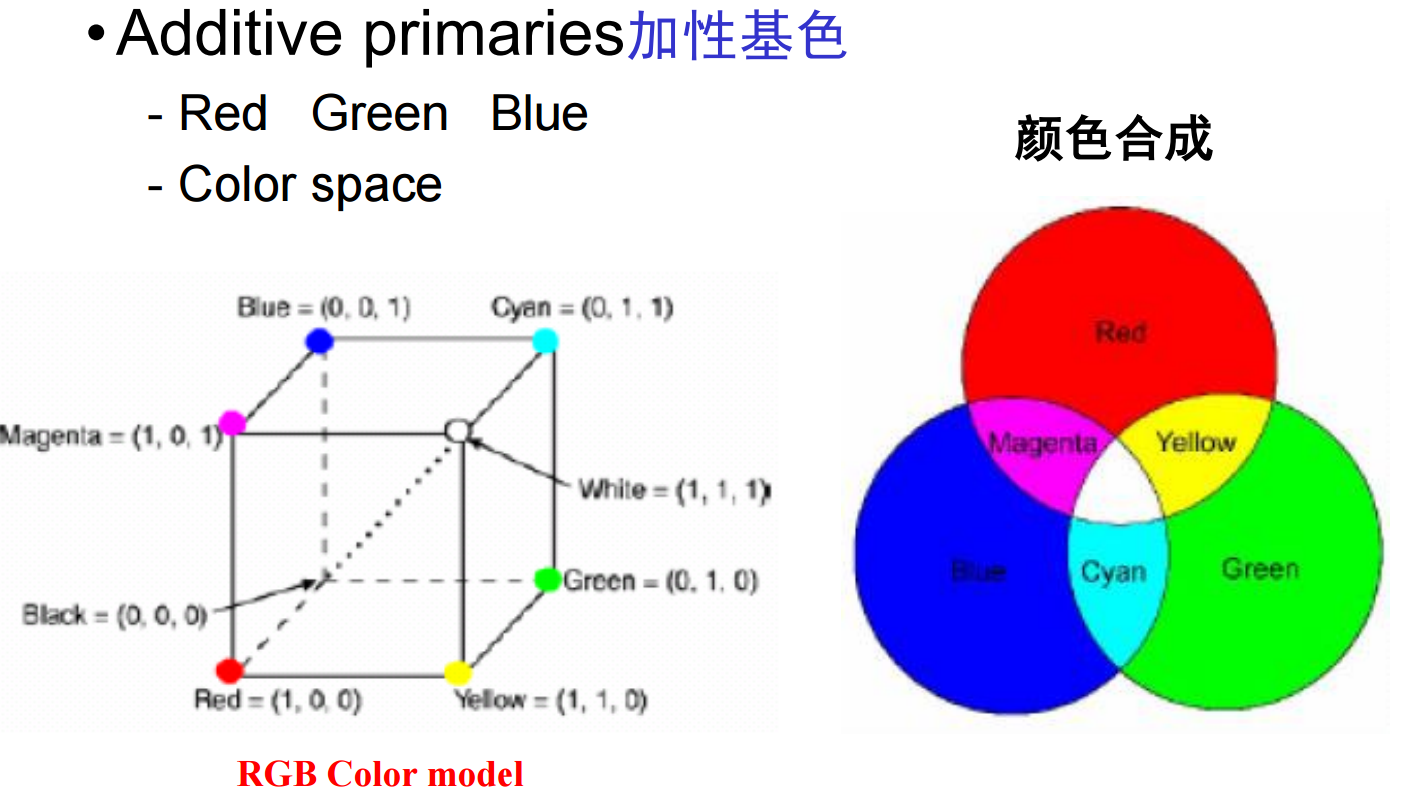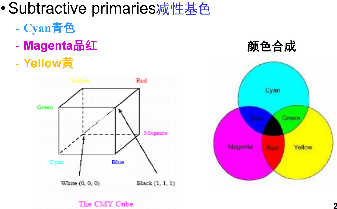 上图使用的是加色模型(Additive color),即将红 (R)、绿 (G)、蓝 (B) 三原色混合得到其他颜色,常用于阴极射线管 (CRT)、投影系统、positive film(正片)。而减色模型(Subtractive color)则利用青色 (C)、品红色 (M) 和黄色 (Y) 滤光片过滤白光,形成颜色,常用于Light-material interactions(光景交互作用)、打印、Negative film(底片)。示意图如下: