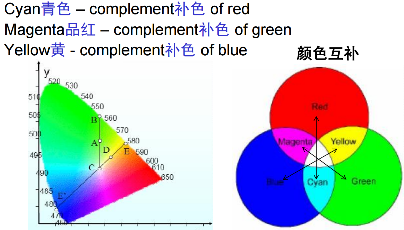 这里还有一个概念“互补色”,指可以混合产生白光的颜色,如: