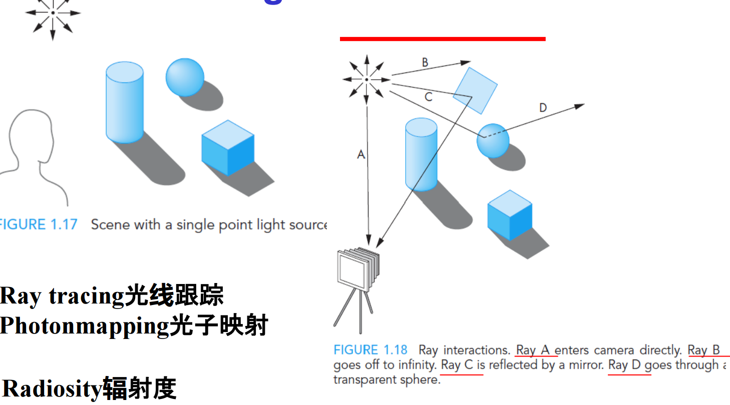 3、光线追踪似乎更符合物理规律,那么为什么我们不用它来设计图形系统呢?对于简单的物体,例如具有简单点光源的多边形和二次曲面,光线追踪是可行的,而且实际上也很简单。原则上,光线追踪可以产生全局光照效果,例如阴影和多次反射,但速度较慢,不适合交互式应用程序。重点是看起来合理,比物理正确更重要。
