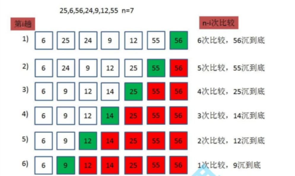 每次两个数字进行比较,如果左边大于右边,那就交换,为什么叫冒泡,因为一次冒泡就可以把一个最大的数字放到最右边