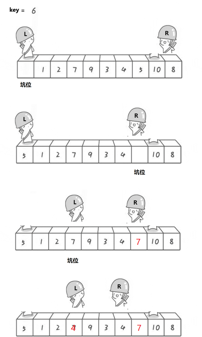 PartSort2:寻找一个坑然后依次填写,先把最左边标记为一个坑,然后right--一直找一个小于基准值的,让其填补左边,然后再更新坑的位置,再让左边找大的去填右边坑,直到left>=right,然后再找个合适位置填写基准值即可