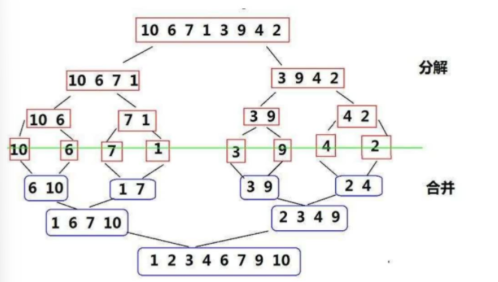 就是进行分组,然后每一组排完序,排序之后再进行合并,采用分治思想将数组分割为子序列,排序后再合并,最终实现整体有序