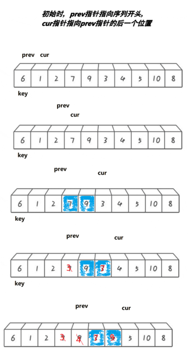 前后指针法 PartSort3:让keyi就是基准值,然后prev就是比keyi小的最后一个元素,如果满足小于条件,prev会进行++,然后再交换,这样prev填的位置就是对的,划分区间,【基准值,小于基准值,大于基准值】,所以最后再给基准值找个位置,那就是prev,直接交换即可,所以最后就变成了【小于基准值,基准值,大于基准值】