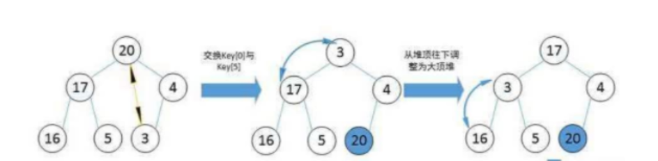 给定一个数组先构建大堆,然后20和3进行交换,因为堆顶是最大元素,所以把最大放到最后,在使用向下调整算法调整成堆,注意向下调整算法中孩子的计算方式