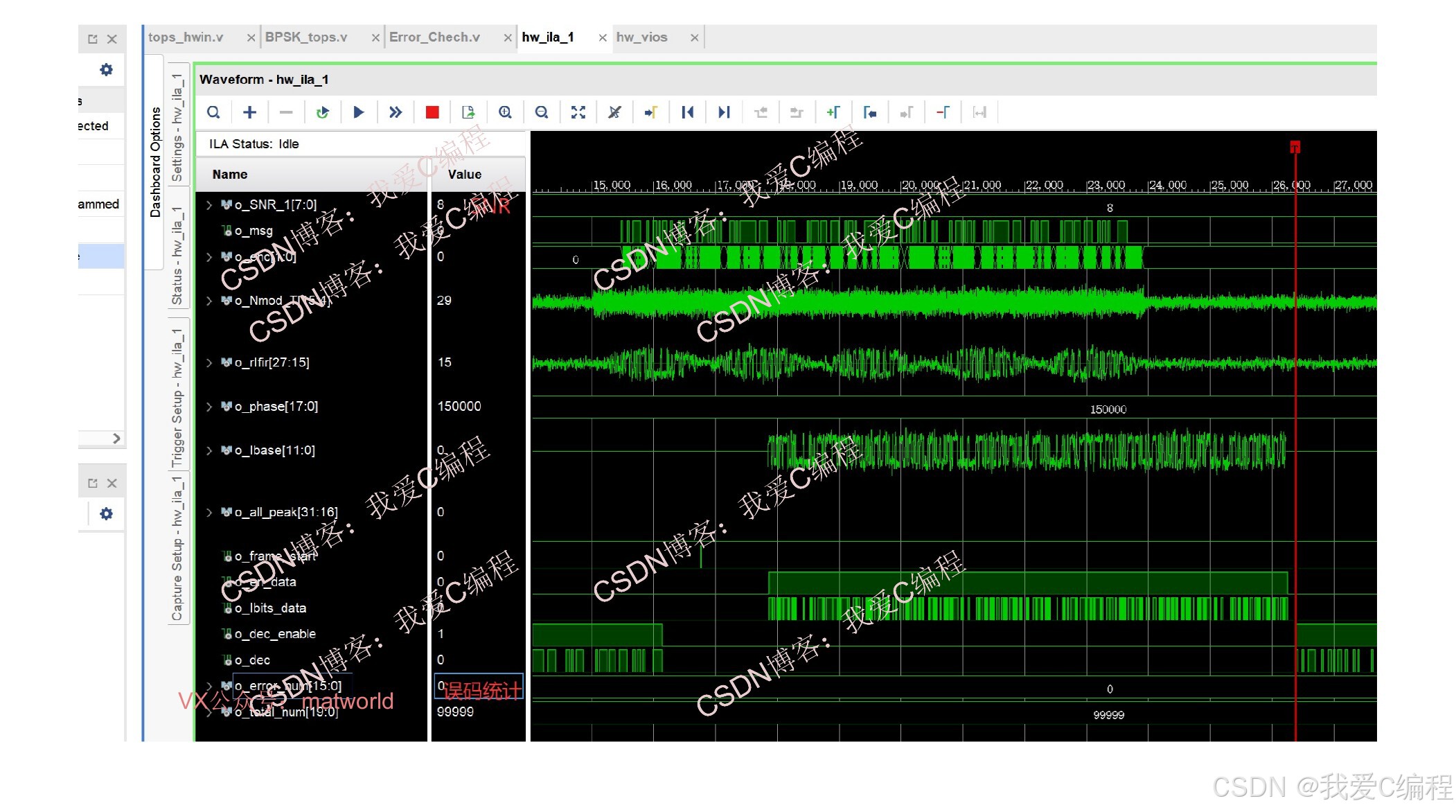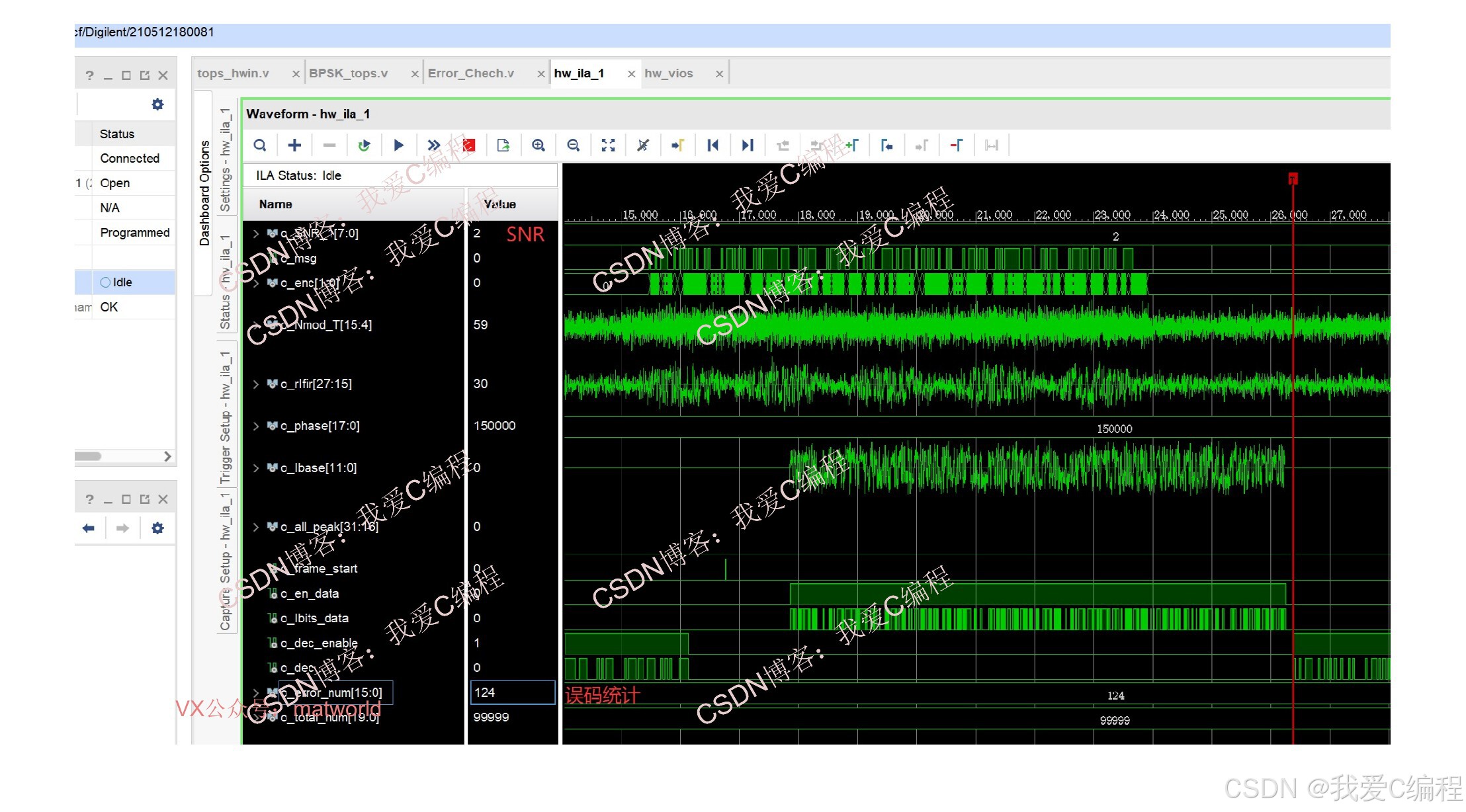 在系统在仿真版本基础上增加了ila在线数据采集模块,vio在线SNR设置模块,数据源模块。硬件ila测试结果如下:(完整代码运行后无水印):