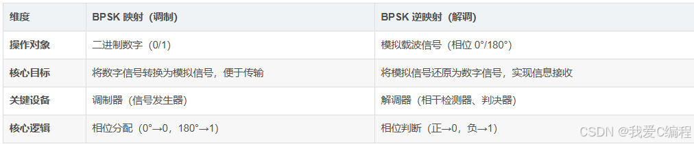 BPSK映射是将二进制数字“0”和“1”映射为两个相反的模拟信号,逆映射则是将接收的模拟信号还原为原始二进制数字。