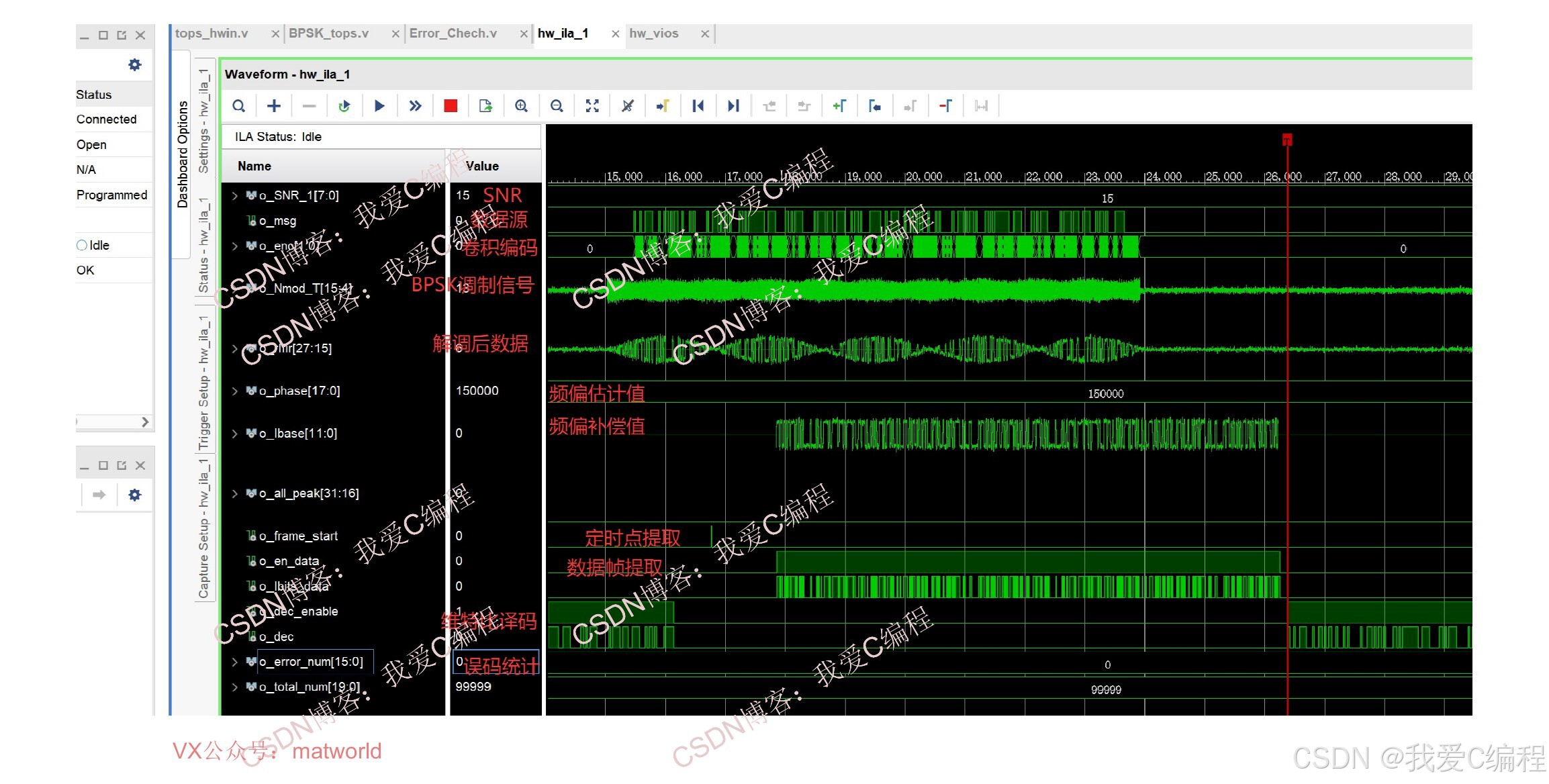 【硬件片内测试】基于FPGA的完整BPSK链路测试,含频偏锁定,帧同步,定时点,Viterbi译码,信道,误码统计