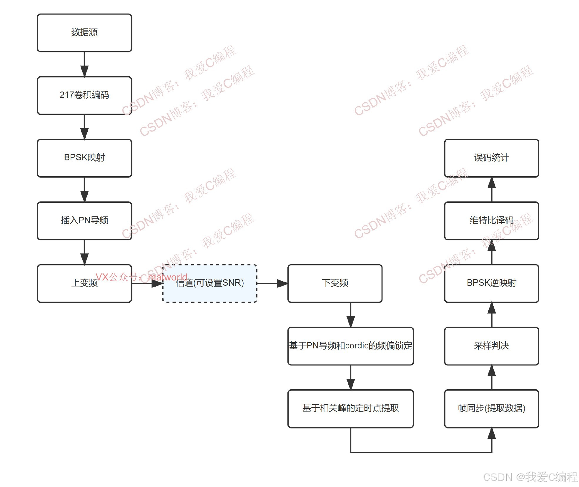 【仿真测试】基于FPGA的完整BPSK通信链路实现,含频偏锁定,帧同步,定时点,Viterbi译码,信道,误码统计