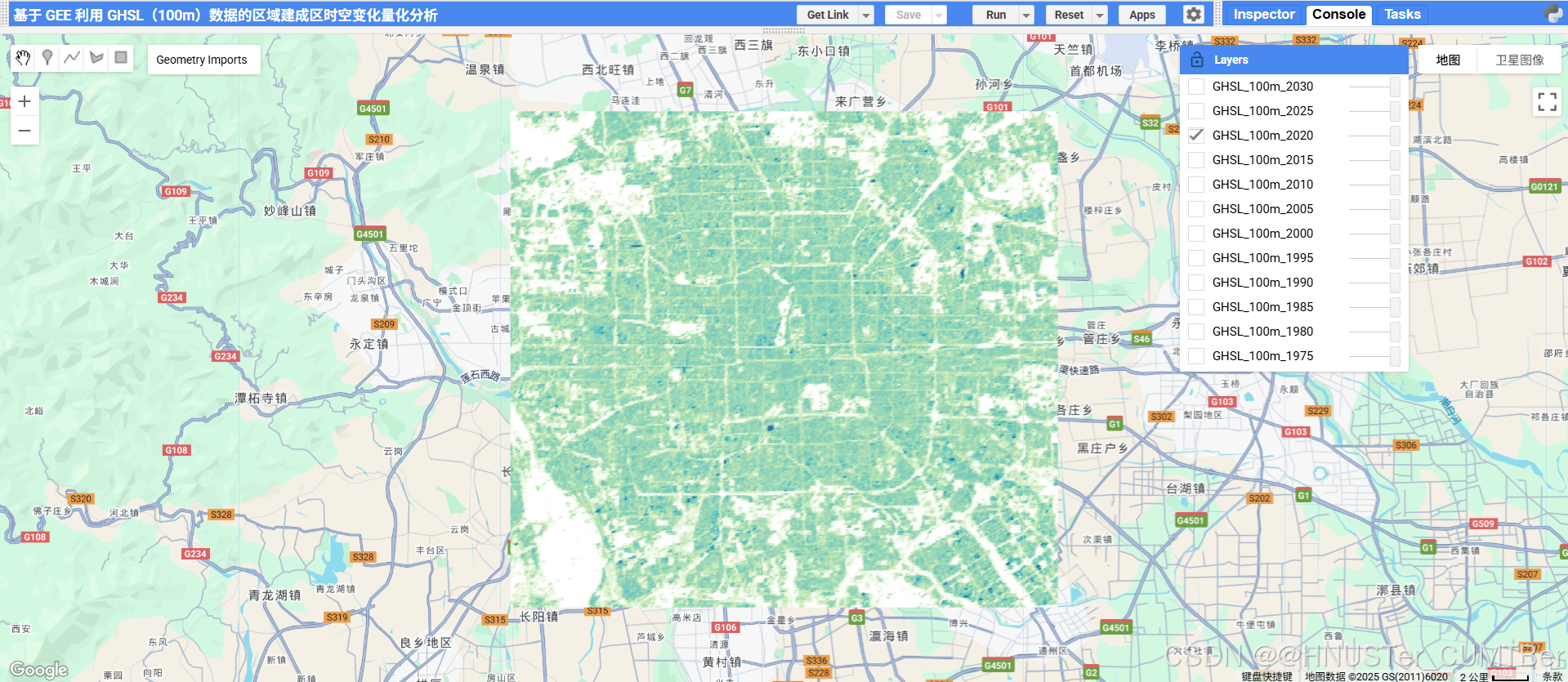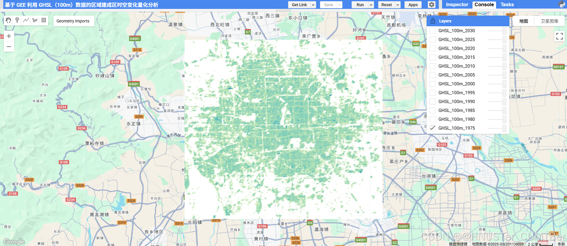 var n = ghsl100.size().getInfo(); // 获取影像数量(客户端变量)for (var i = 0; i < n; i++) {var img = ee.Image(ghslList.get(i)); // 提取单幅影像var time = ee.Date(img.get('system:time_start')).format('YYYY').getInfo(); // 提取年份Map.addLayer(img.clip(roi), visParams, 'GHSL_100m_' + time, false); // 添加图层